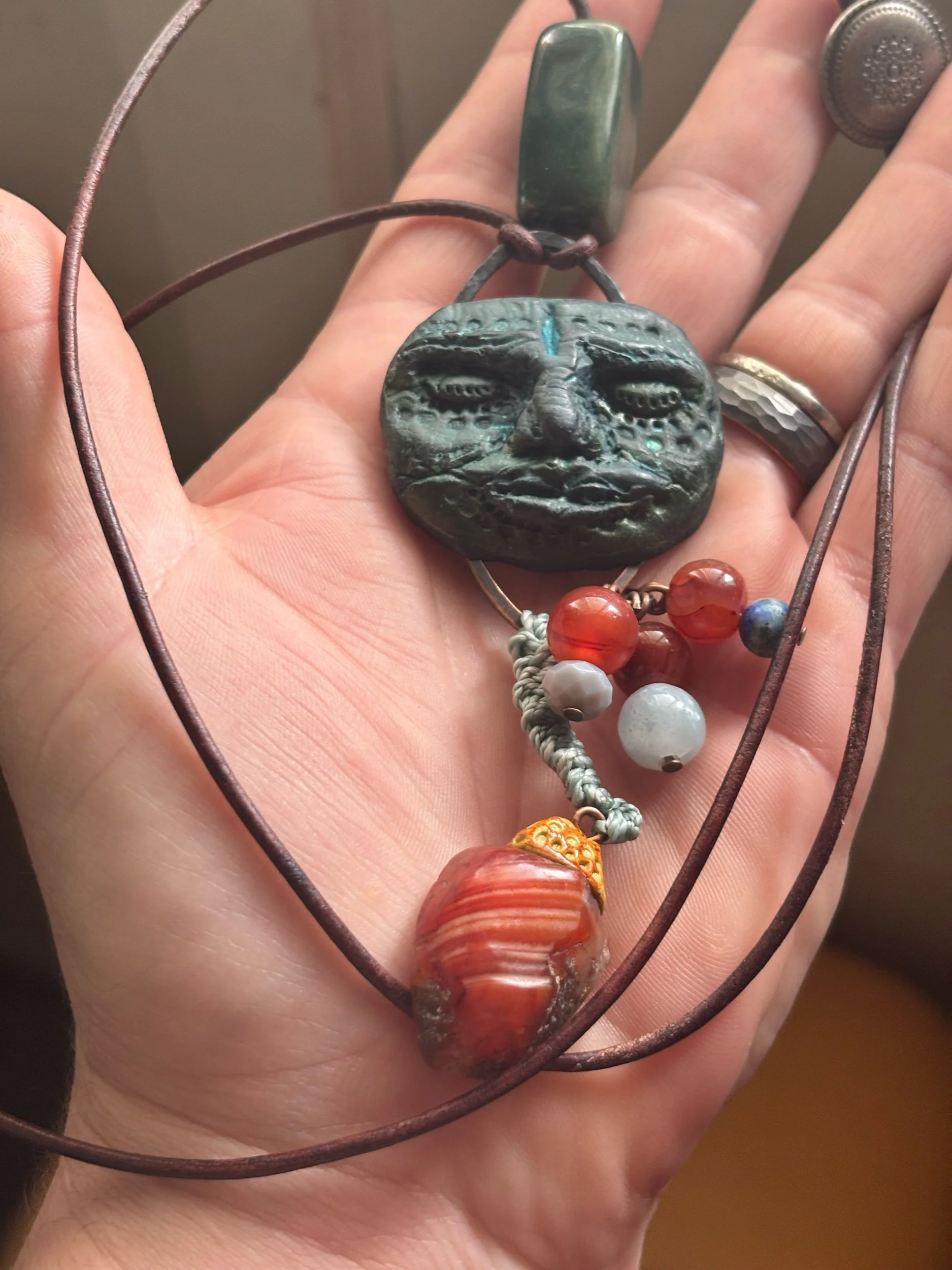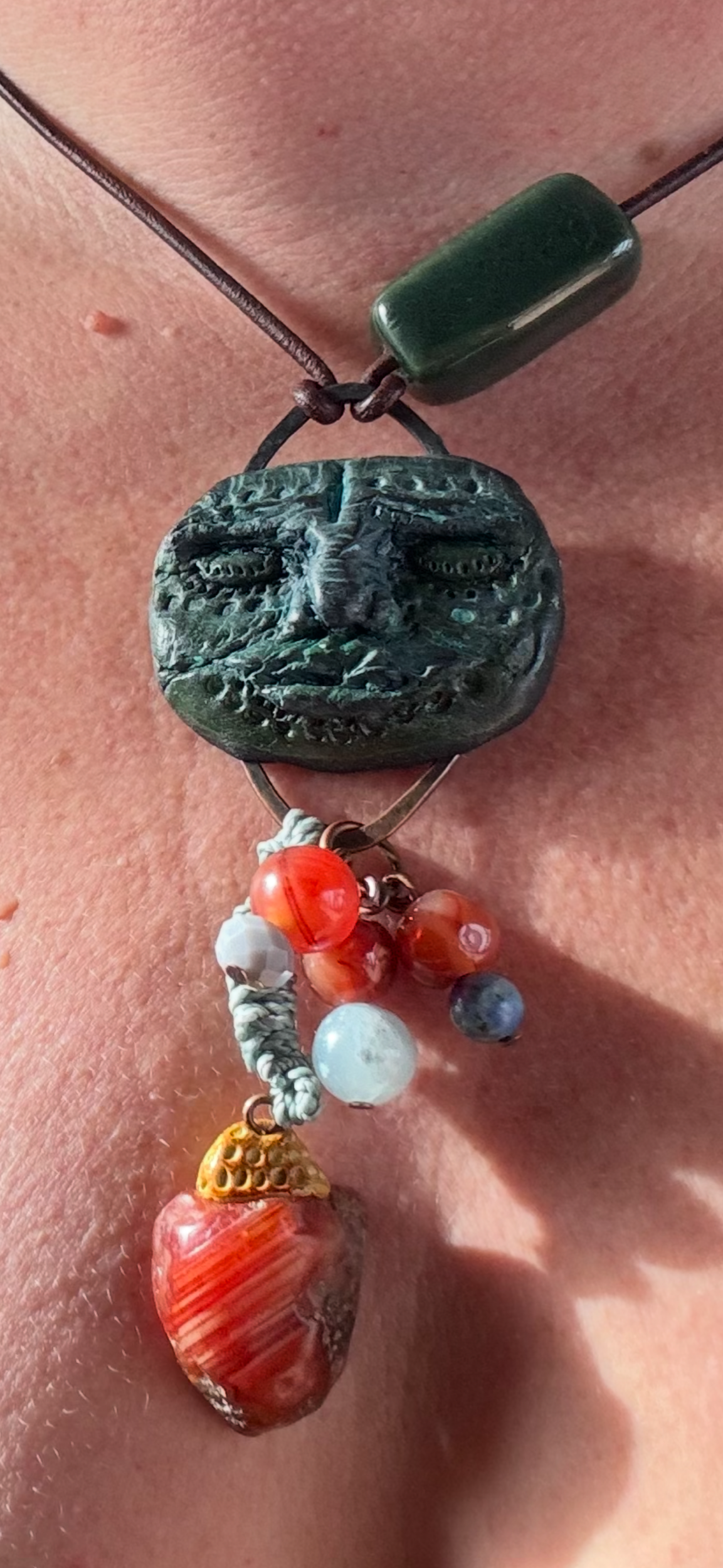 Sculpted with Aves clay, reclaimed copper, up-cycled carnelian beads and button.knotted with waxed thread . Genuine leather brown strap